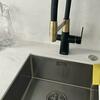 Кухня в стиле модерн, брали под цвет напыления мойки, понравились золотые ставки и приятная текстура покрытия, благодаря этому смеситель выделяется на фоне раковины. Есть возможность встроить фильтр для воды. Качество весьма неплохое и цена не кусается